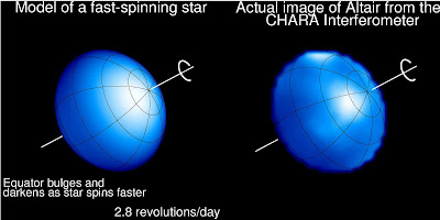 Altair in the constellation Aquila, about twice as big as the Sun and 18 light years away, is rotating rapidly so that it is flattened. The image on the right has been created using interferometry with light waves. Credit: Ming Zhao (University of Michigan), from Imaging the Surface of Altair, John D. Monnier et al, arXiv:0706.0867v2. - Ocean waves are generated by fluctuating wind pressure on the water surface. Due to the dispersion of the phase velocity (longer waves run faster) and a weak interaction between different waves transferring energy to longer waves, dominant waves are the bigger the stronger and longer the wind blows. Together with the effect of opposing ocean currents, very big waves can emerge. In Rogue waves, Chris Garrett and Johannes Gemmrich look at the "rich and challenging physics [...] behind the gigantic ocean waves that seem to appear without warning to damage ships or sweep people off rocky shores."