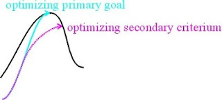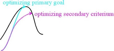 The difference can be illustrated in a simple diagram (see below). A primary goal is a local optimum in some fitness landscape – it’s where you want to go. A secondary criterion is the first approximation for the direction towards the local optimum. But once you’re on the way, higher-order corrections must be taken into account, otherwise the secondary criterion will miss the goal – often badly.