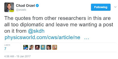 Here is a different example for this idiocy. High energy physicists think it’s a problem that the mass of the Higgs is 15 orders of magnitude smaller than the Planck mass because that means you’d need two constants to cancel each other for 15 digits. That’s supposedly unlikely, but please don’t ask anyone according to which probability distribution it’s unlikely. Because they can’t answer that question. Indeed, depending on character, they’ll either walk off or talk down to you. Guess how I know.