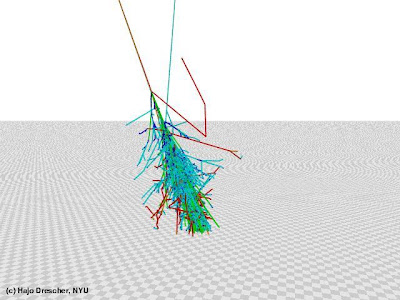 Here, the primary particle was a proton with an energy of 1019 eV, the colors indicate blue: electrons/positrons, cyan: photons, red: neutrons, orange: protons, gray: mesons, green: muons. (Unfortunately, one can't see the colors very clearly, you can decompose the shower into colors on the website. The incoming proton is the line from the upper left, the other upgoing line is cyan and a photon). If you have Quicktime installed, you can also look at this very illustrative movie, which shows the particles cascading down on earth. The above figure has be created using the software SENECA (down-loadable here), the competitor is AIRES, which has a somewhat more impressive advertisement movie (the exact differences between both codes elude me).