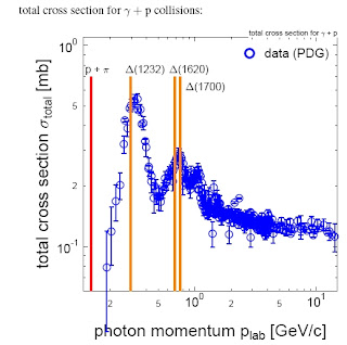 The figure to the left (credits go to Stefan) shows the cross-section for photon-proton scattering in the laboratory (proton in rest), the blue dots are data from the particle data booklet. The red line indicates the initial threshold for the process to take place, the orange lines are the delta resonances where the cross-section has peaks.
