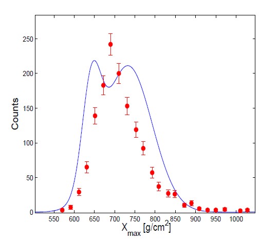 | Fig 2 from arXiv:1204.1488. Shown is the number of events in the energy bin 1 to 1.25 x 106 TeV as a function of the penetration depth. The red dots are the data from the Pierre Auger Collaboration (arXiv:1107.4804), the solid blue line is the expectation for a combination of protons and Fe nuclei. |