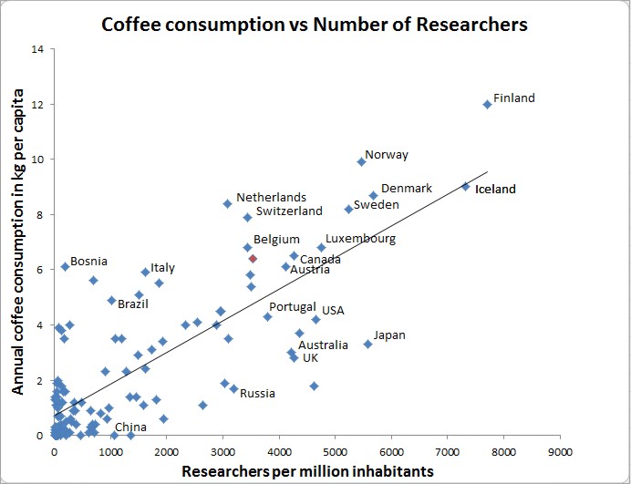 If you want to play with the data, you can download the excel sheet here. I've left out Singapore from the table because I wasn't sure whether the entry "0" meant there's no data, or nobody in Singapore drinks coffee. I've made a second plot where I left out the 15 main coffee export countries (according to Wikipedia), but visually it doesn't make much of a difference so I'm not showing you the graph. (It's in the excel sheet.) According to chartsbin.com the data on researchers per million inhabitants is from the UNESCO Institute for Statistics, and the data on coffee consumption is from the World Resources Institute.