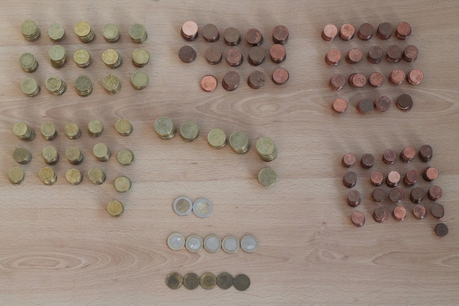 pile of money whose value you have been guessing came out to be 68.22 Euro and 0.5 Deutsche Mark, the latter of which I didn't count. Hoping that I didn't miss anybody's guess, this means the three winning entries are: